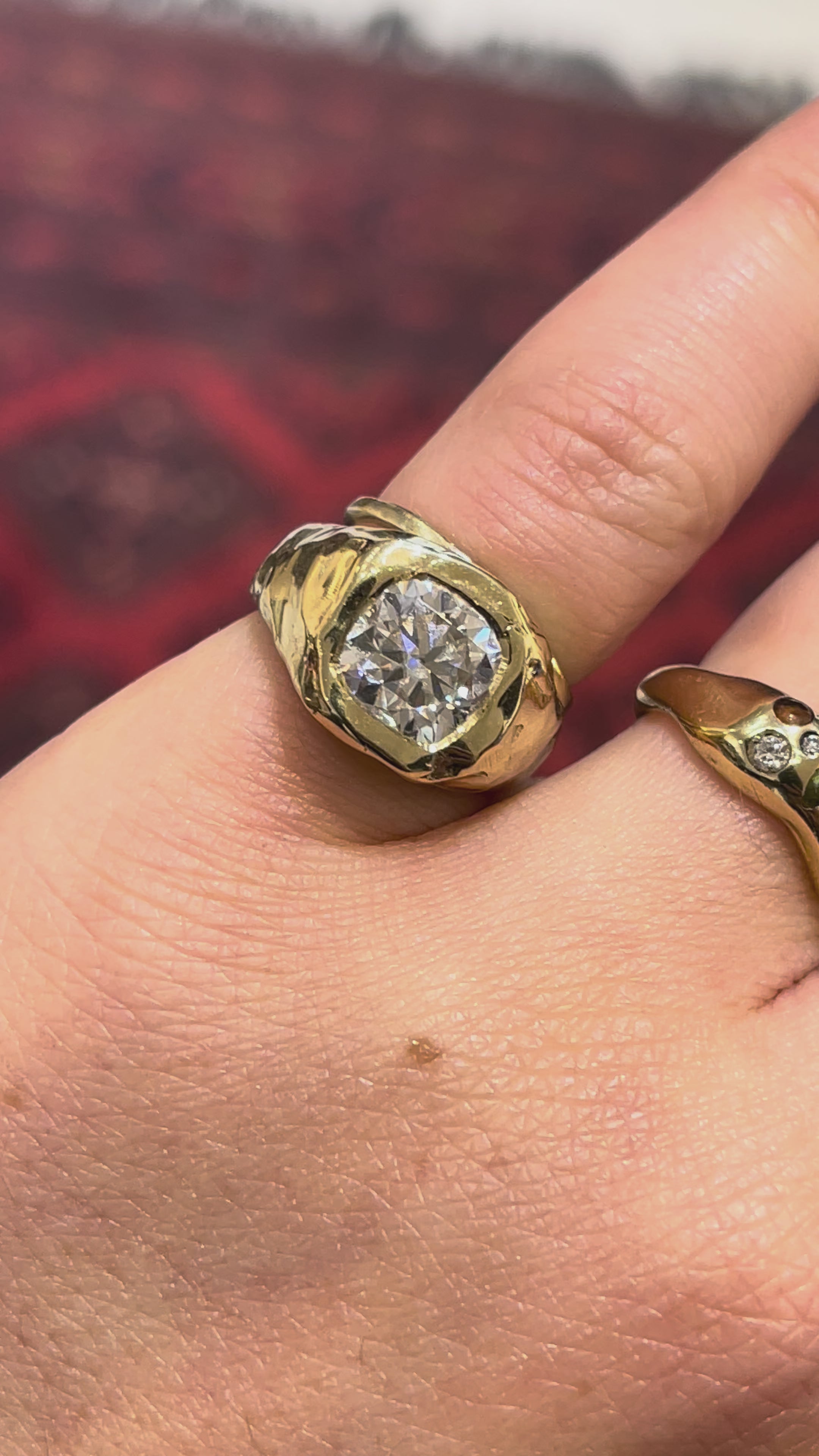 A bold- hammered , handcrafted statement piece featuring a 2-carat lab-grown cushion-cut diamond in bezel setting. Blair blends vintage charm with modern edge, perfect for the pinky — or any finger you love.