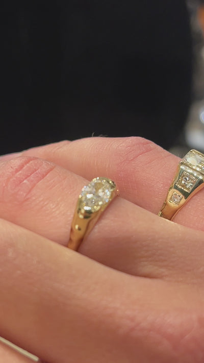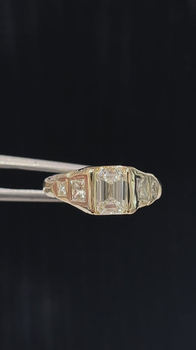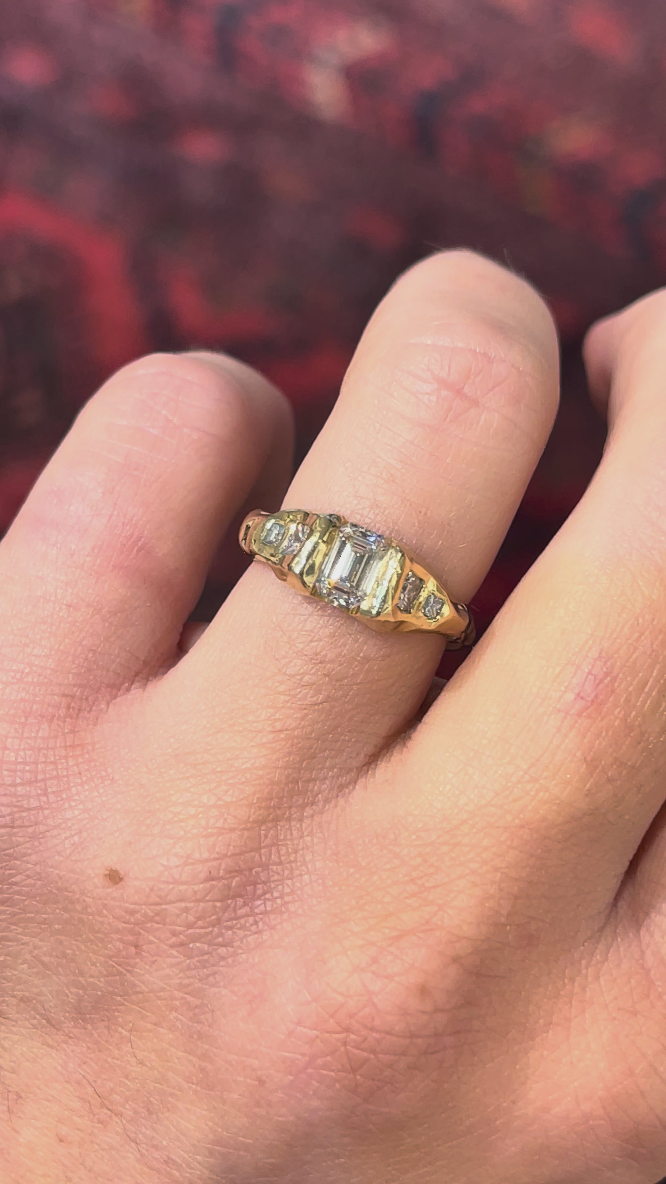 A stunning 0.73ct Emerald cut diamond and 0.3tcw Princess cut side diamonds set in a handcrafted 14K gold ring with a unique Row & Bold texture. Customize your ring by choosing the diamond cut and carat weight, and feel free to request any changes you desire!