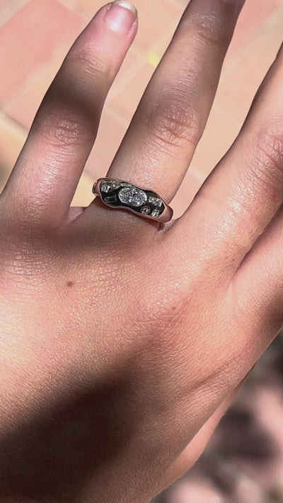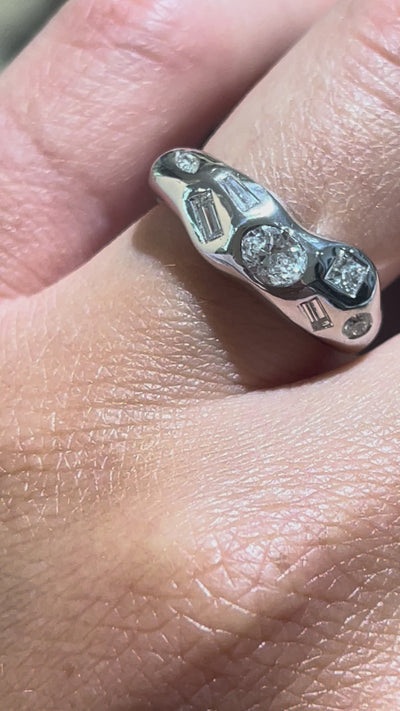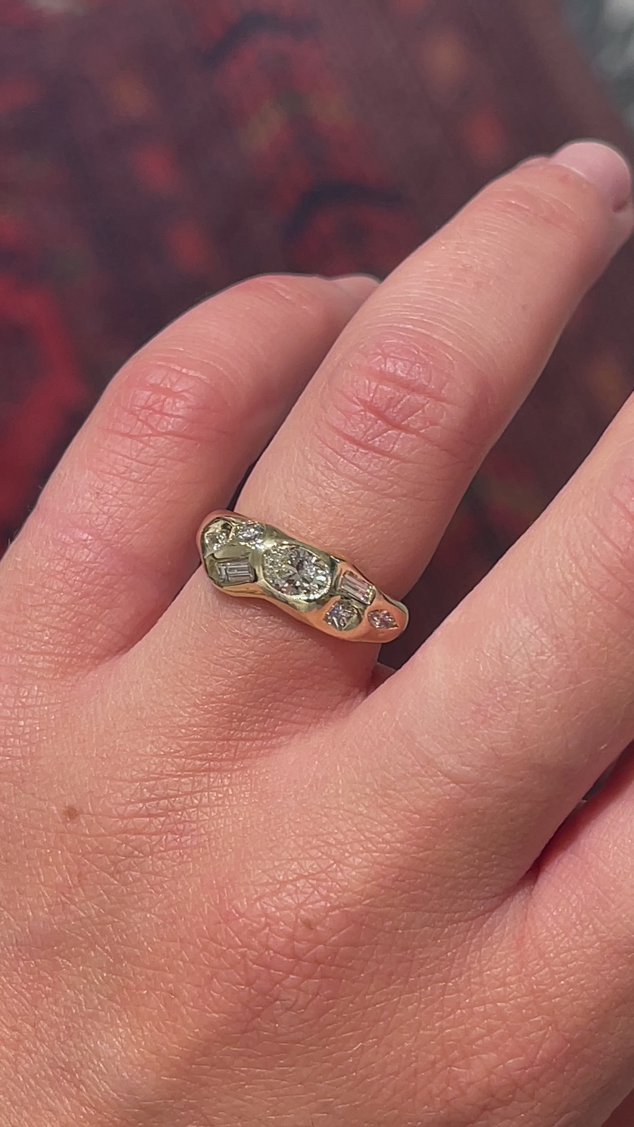 Mariana Ring is created with a custom design. The ring features an inlaid setting adorned with a total carat weight of 1, showcasing an array of stunning diamond shapes, with a radiant oval-cut diamond at its center. The Mariana Ring can be customized with personal design input, focusing on composition and stones.
