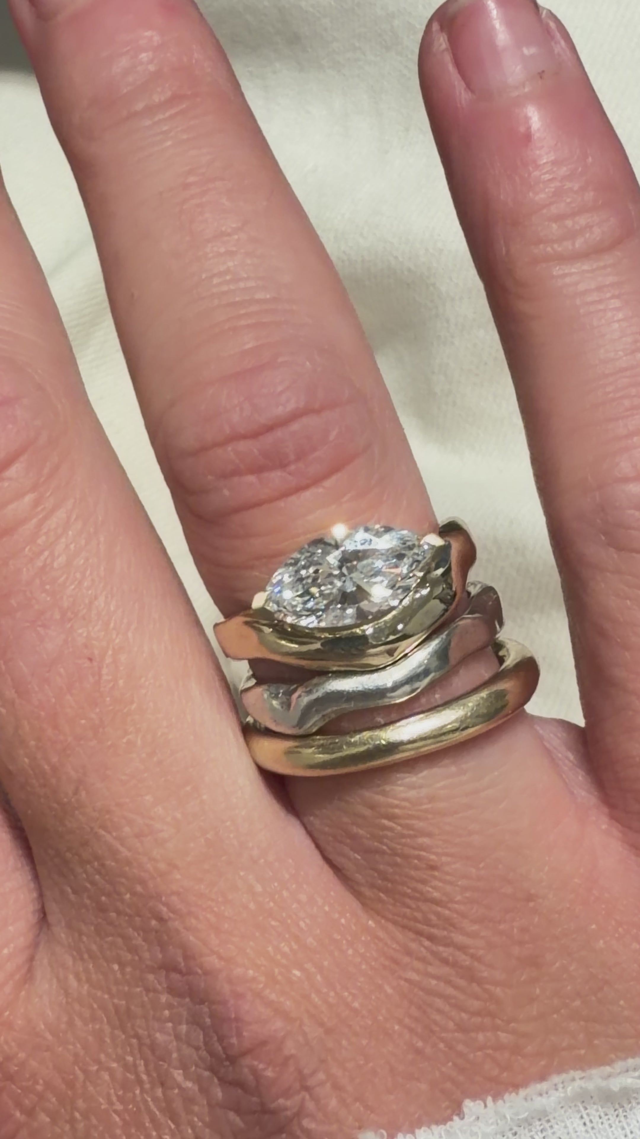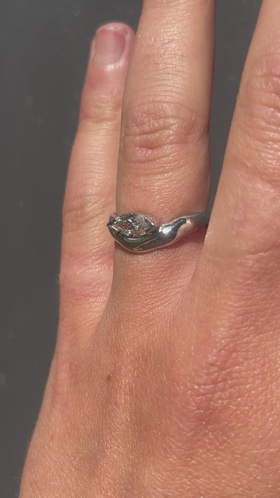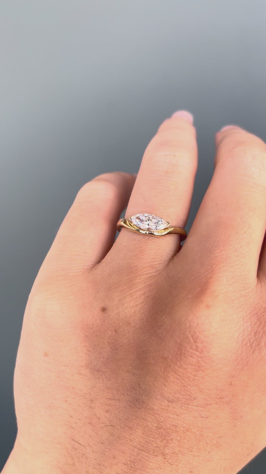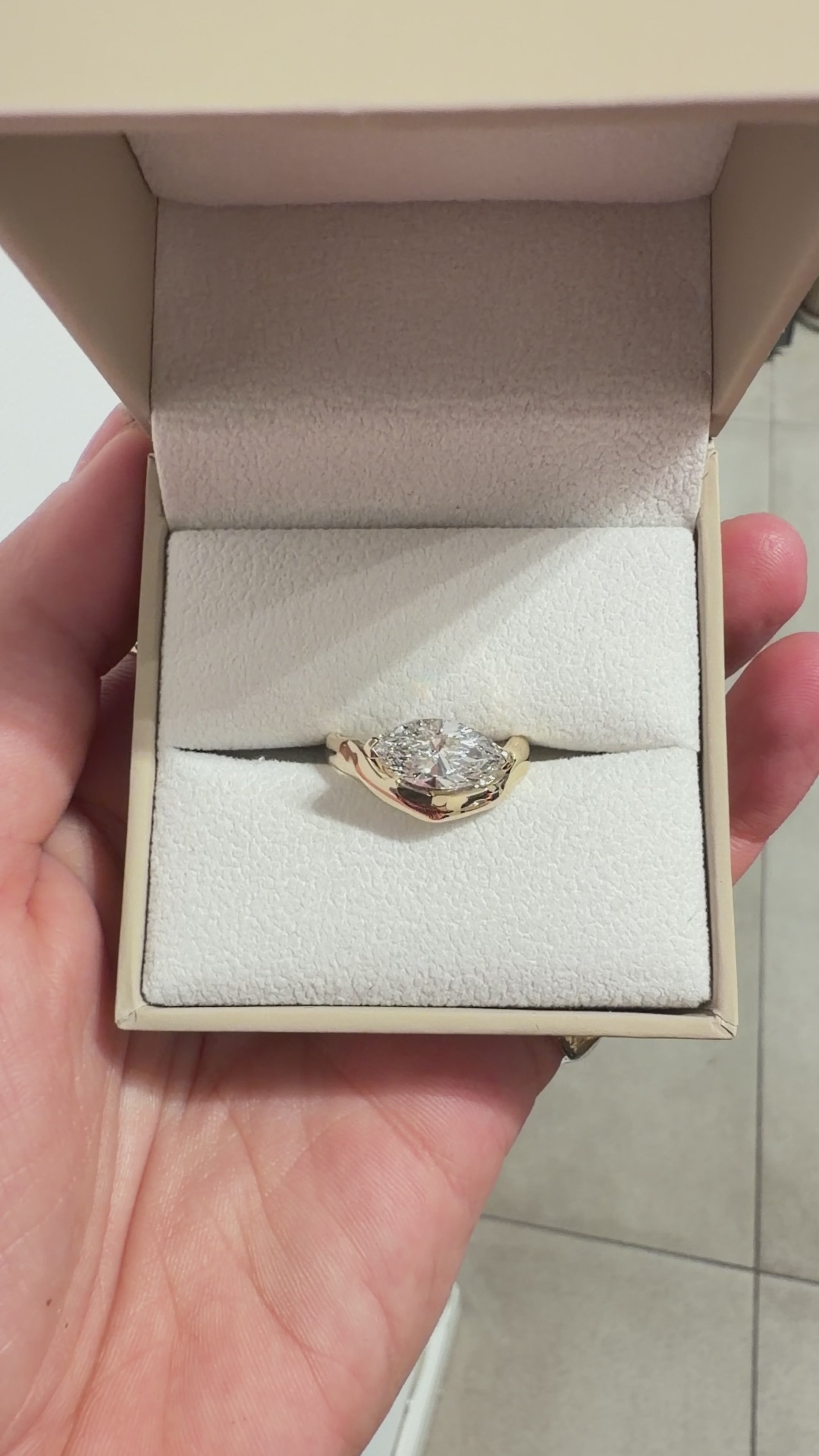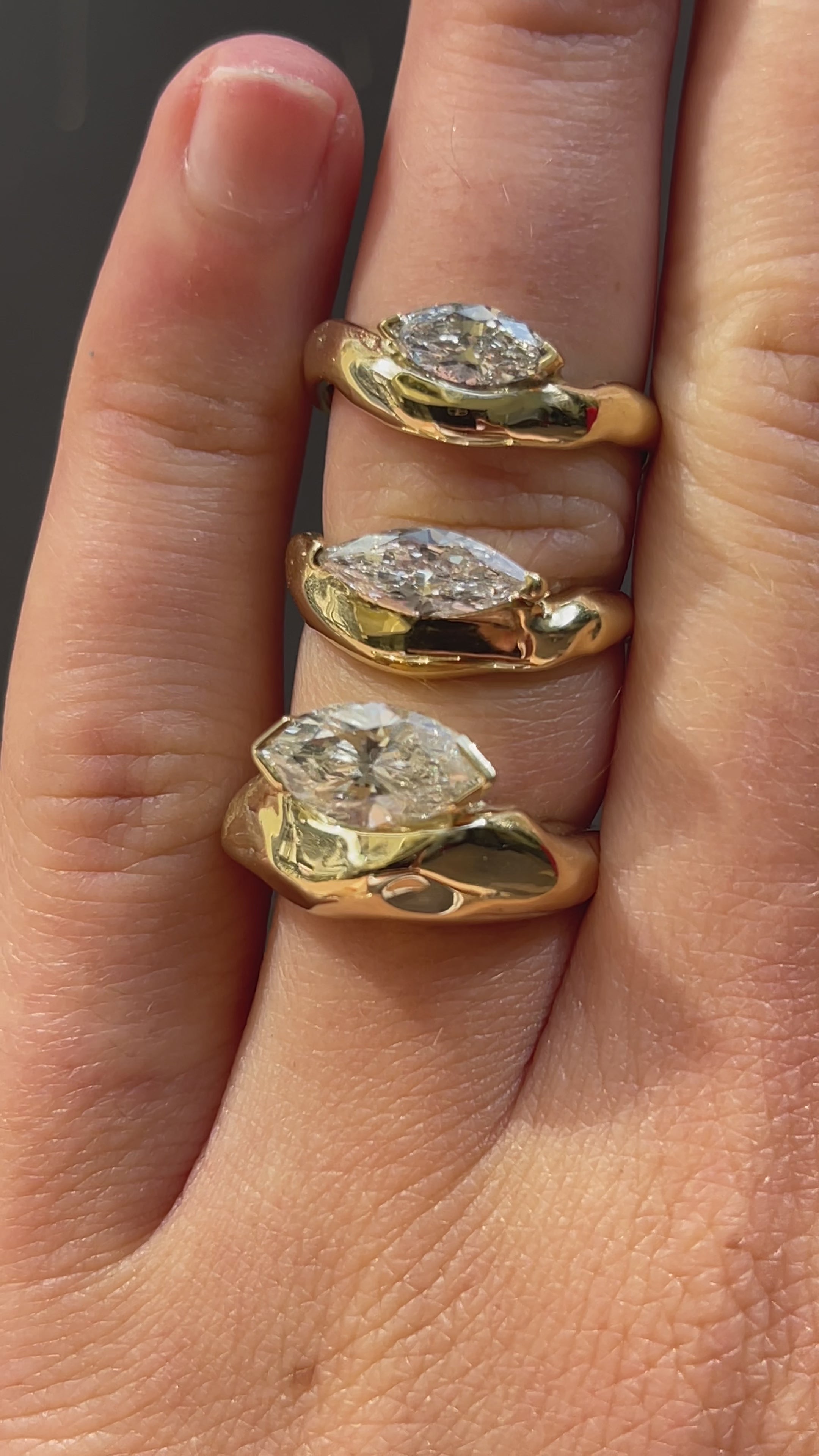 A bold and captivating statement piece. The Venus ring features a 2.5-carat marquise diamond, floating above a chunky gold band with a fluid, asymmetrical finish. Handcrafted with a soulful edge — stylish, unique, and full of presence.